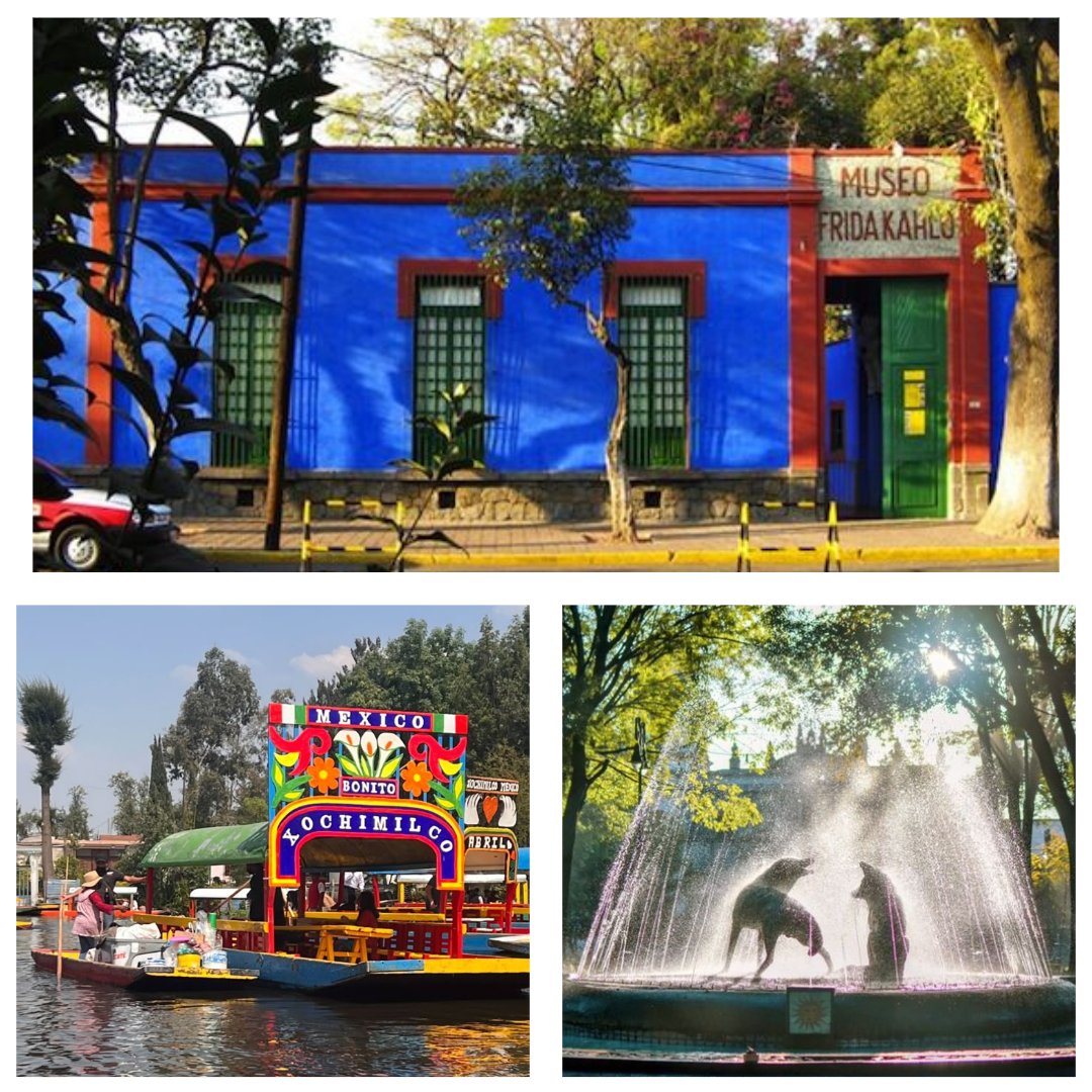 **Coyoacán**: Pasea por sus calles adoquinadas, donde el arte y la historia se entrelazan. Visita la Casa Azul (Panorámica), hogar de la famosa pintora Frida Kahlo, y explora el vibrante mercado local, donde podrás degustar auténtica comida mexicana. Disfruta de la atmósfera bohemia y los coloridos murales que adornan la zona.